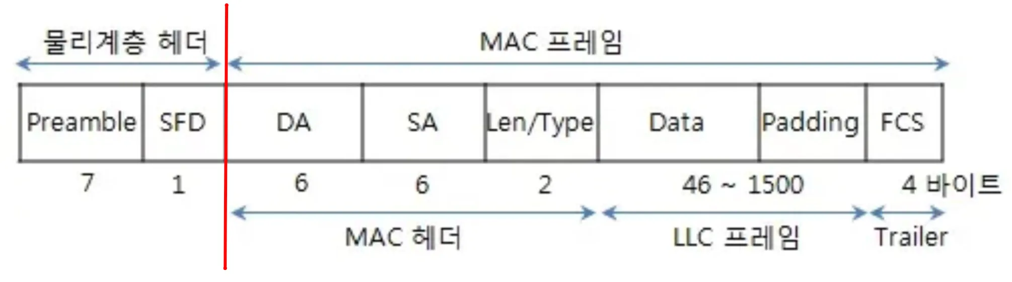 : MAC Header + (3계층에서 온 패킷) + Trailer ⇒ MAC Frame (실질적인 데이터) - 2계층 → 1계층 (캡슐화)