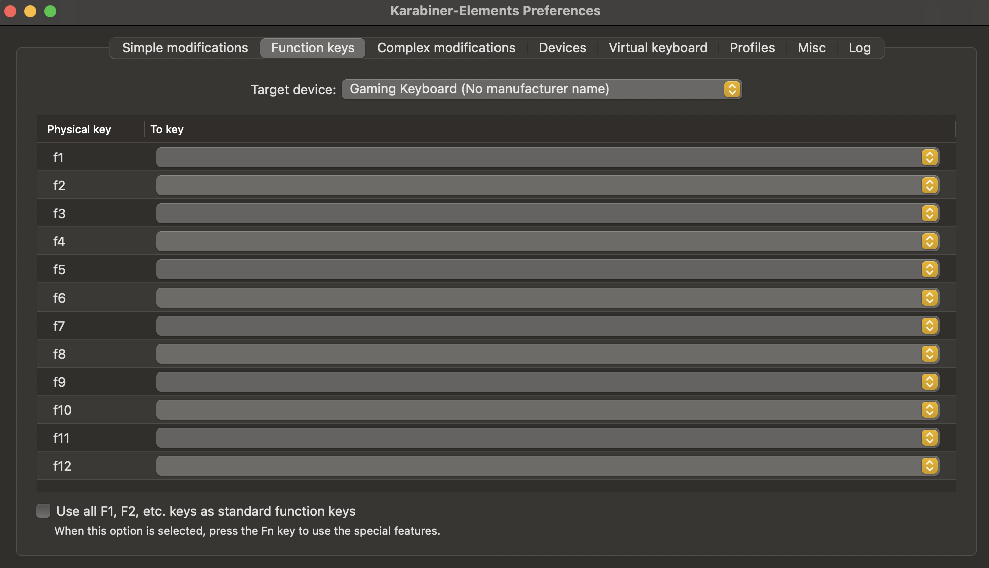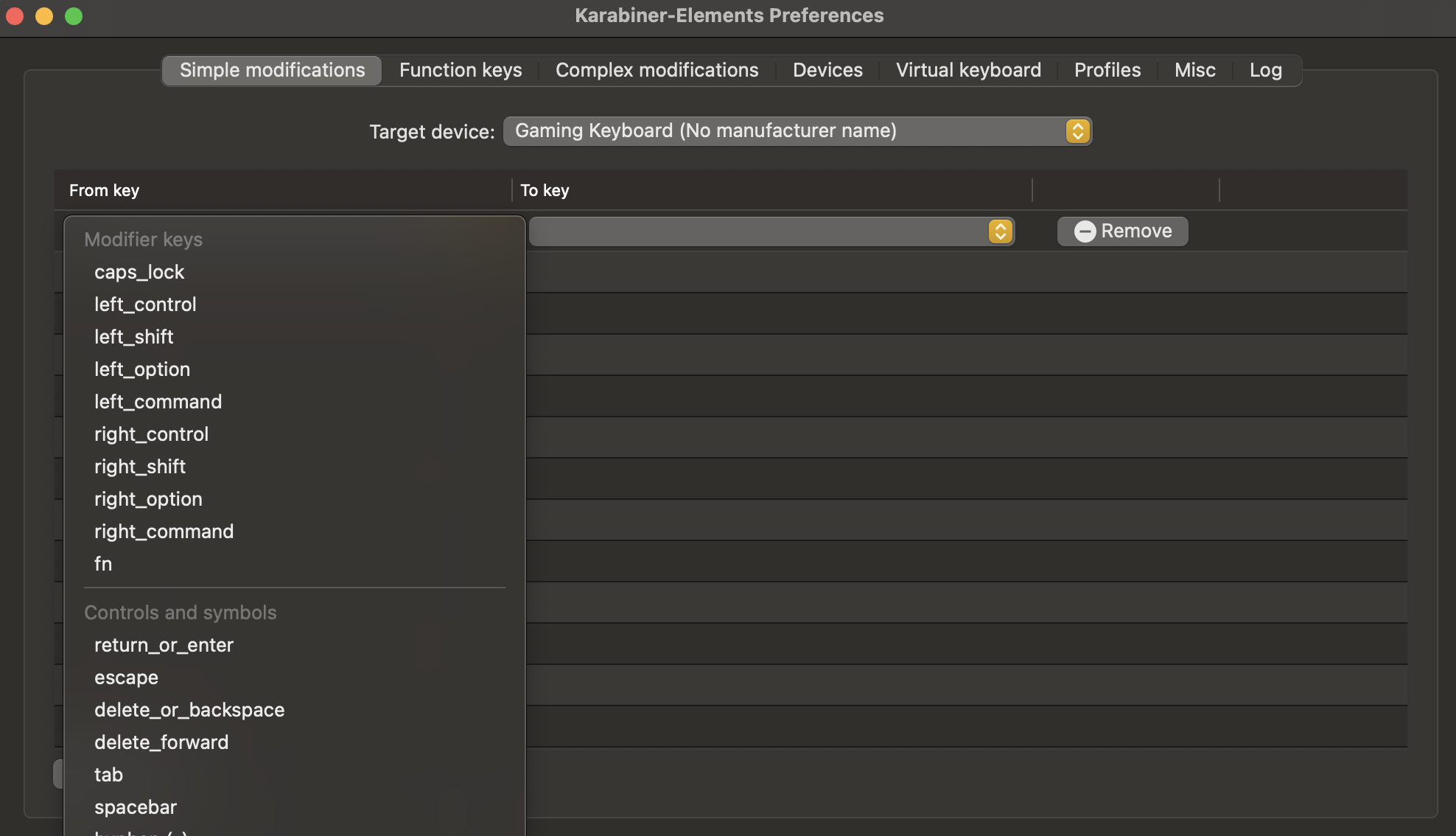 일단 먼저 Target device 같은 경우에는 해당 설정들을 적용할 범위를 지정해주는 것과 같다. 맥북 키보드도 같이 변경해줄 수 있고, 연결한 기계식 키보드만 바꿔줄 수도 있다. (여러가지가 존재하지만 나는 기계식 키보드만 설정해주면 되서 Gaming Keyboard를 클릭해서 지정해주었다.)