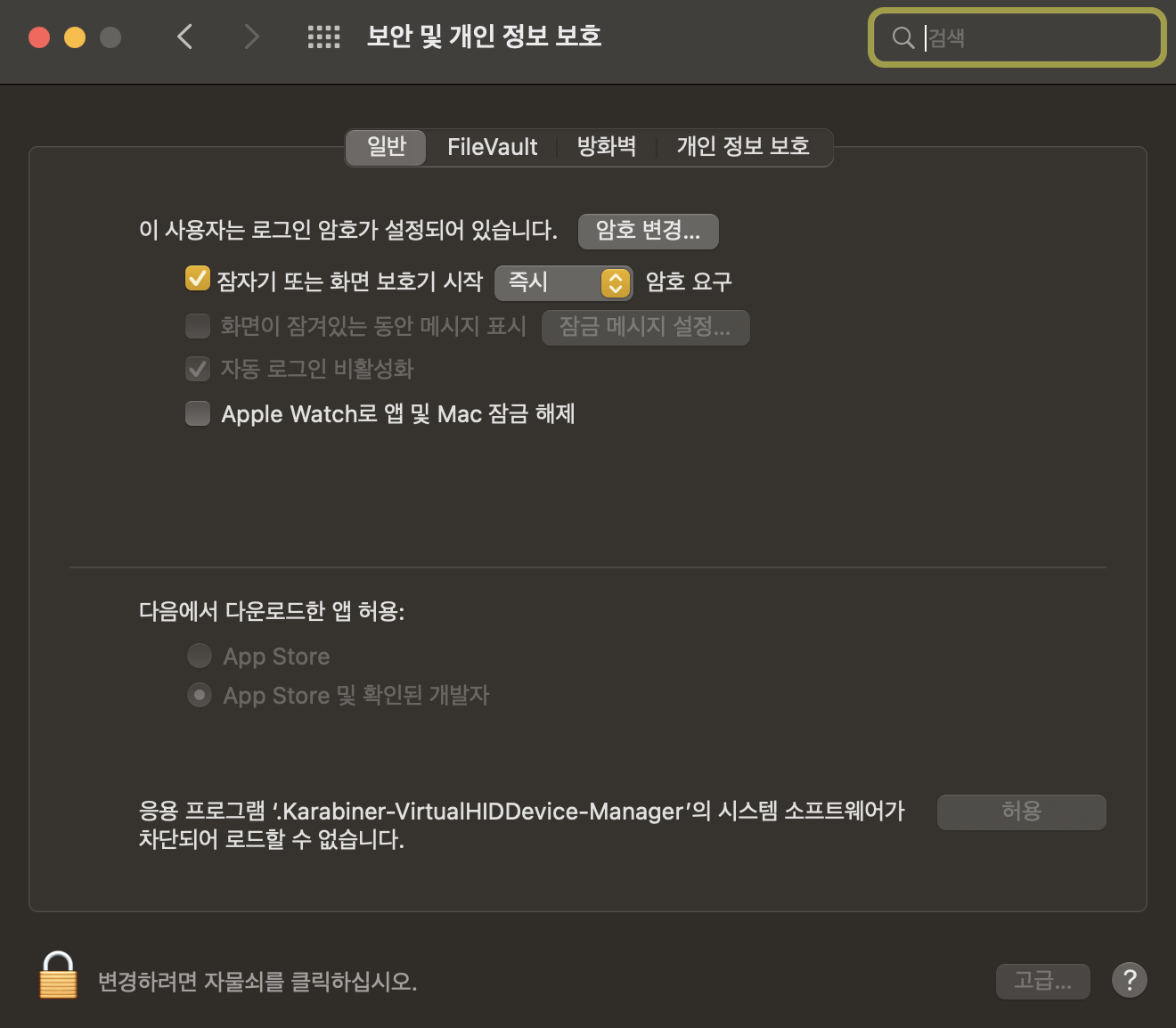 만약 저 두 가지를 허용 해줬는데도 실행이 되지 않을 수 있다. 그럴 경우, '보안 및 개인 정보 보호 - 일반'에 들어가보면 하단에 '응용 프로그램 '.Karabiner-Virtual~'의 시스템 소프트웨어가 차단되어 로드할 수 없습니다.' 라는 문구가 보인다. 해당 문구 옆에 허용 버튼을 눌러주면 잘 실행된다.