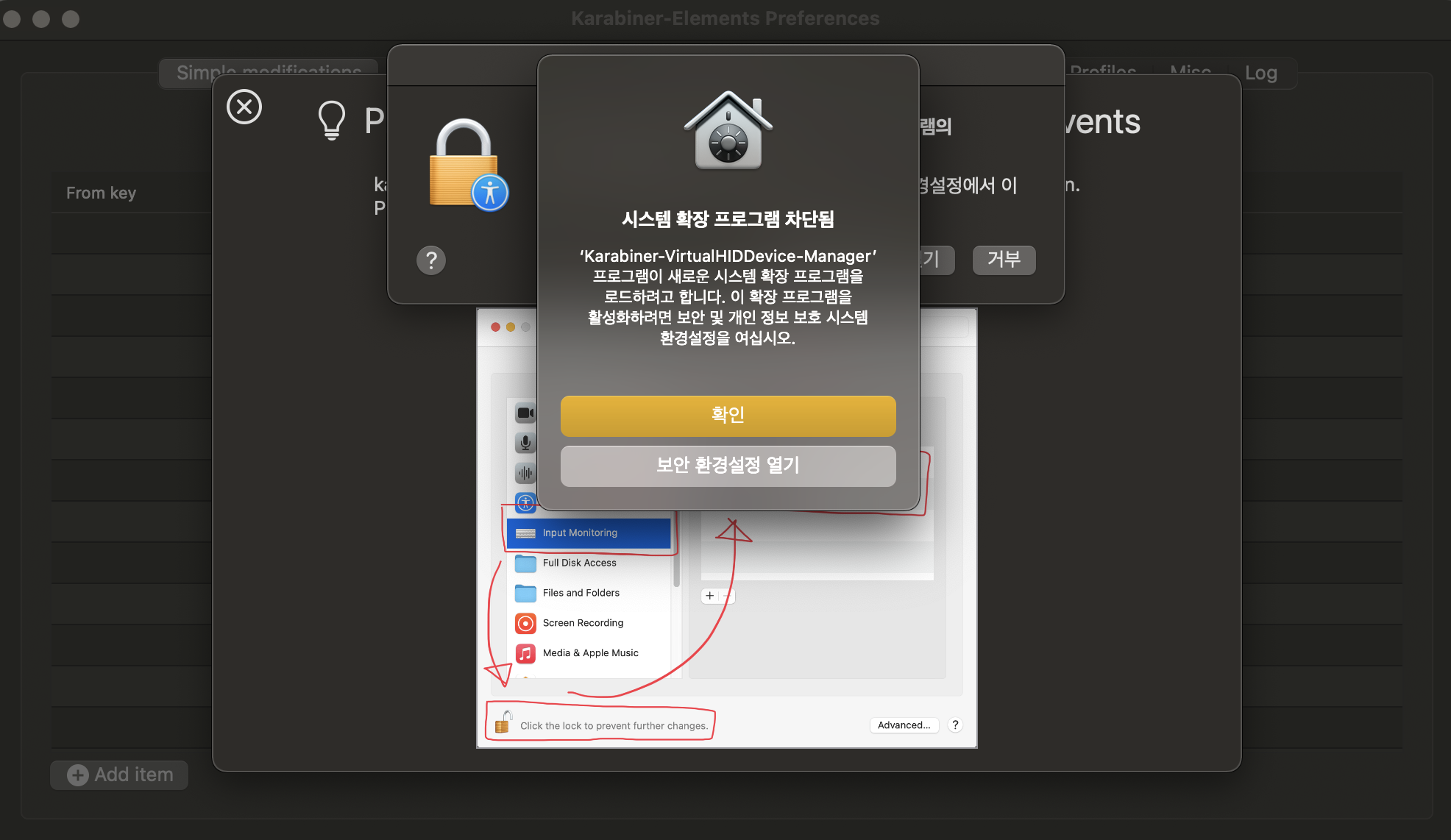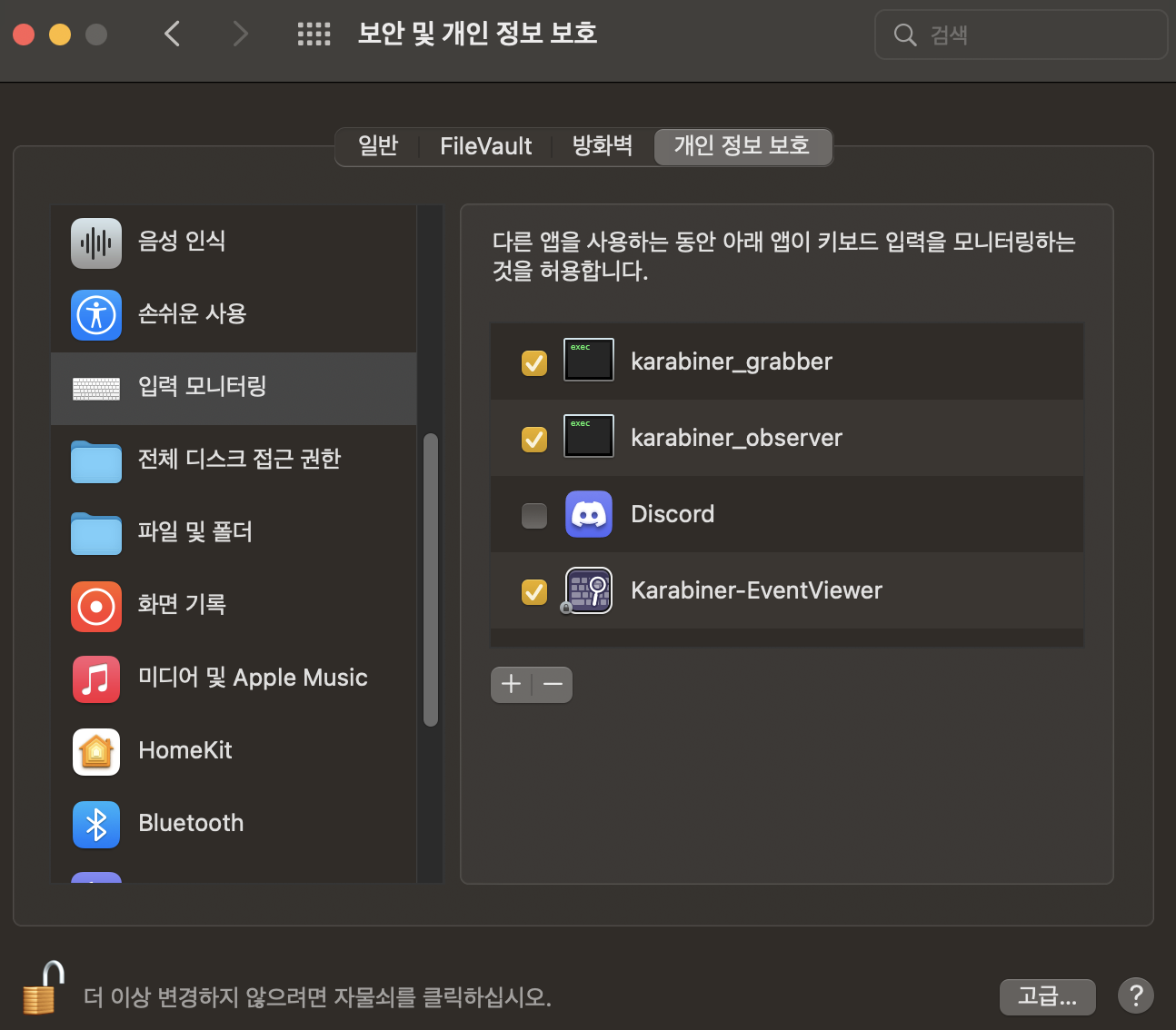 보안 환경설정 열기 버튼을 누르고, '보안 및 개인 정보 보호 - 개인 정보 보호 - 입력 모니터링'순으로 들어가서 karabiner_grabber, karabiner_observer 두 개를 허용해주면 정상적으로 프로그램을 사용할 수 있다.
