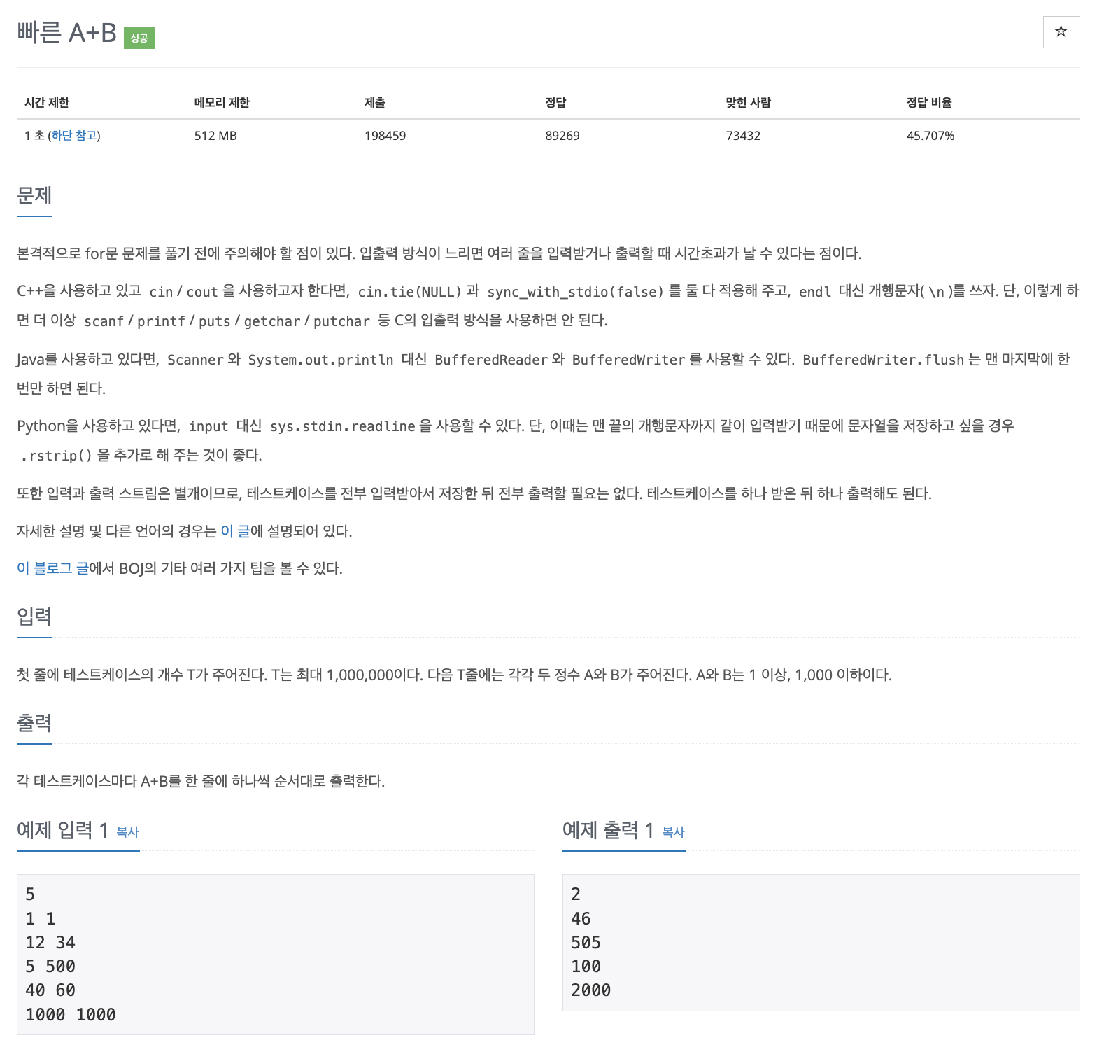 - 반복문 for문을 통해 a, b의 입력을 받고 a+b 결과 출력을 테스트케이스 개수만큼 반복적으로 실행시켜 준다.